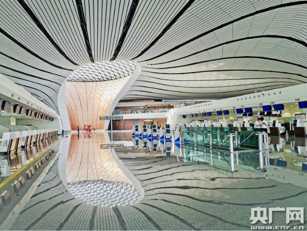 大兴机场航站楼采用五指廊放射构型。记者了解到,大兴机场航站楼创新地采用了功能区垂直分布、候机区可切换的楼层设计,既保障了功能区内运行资源充足的发展空间,又使国际和国内候机区能够灵活调整。