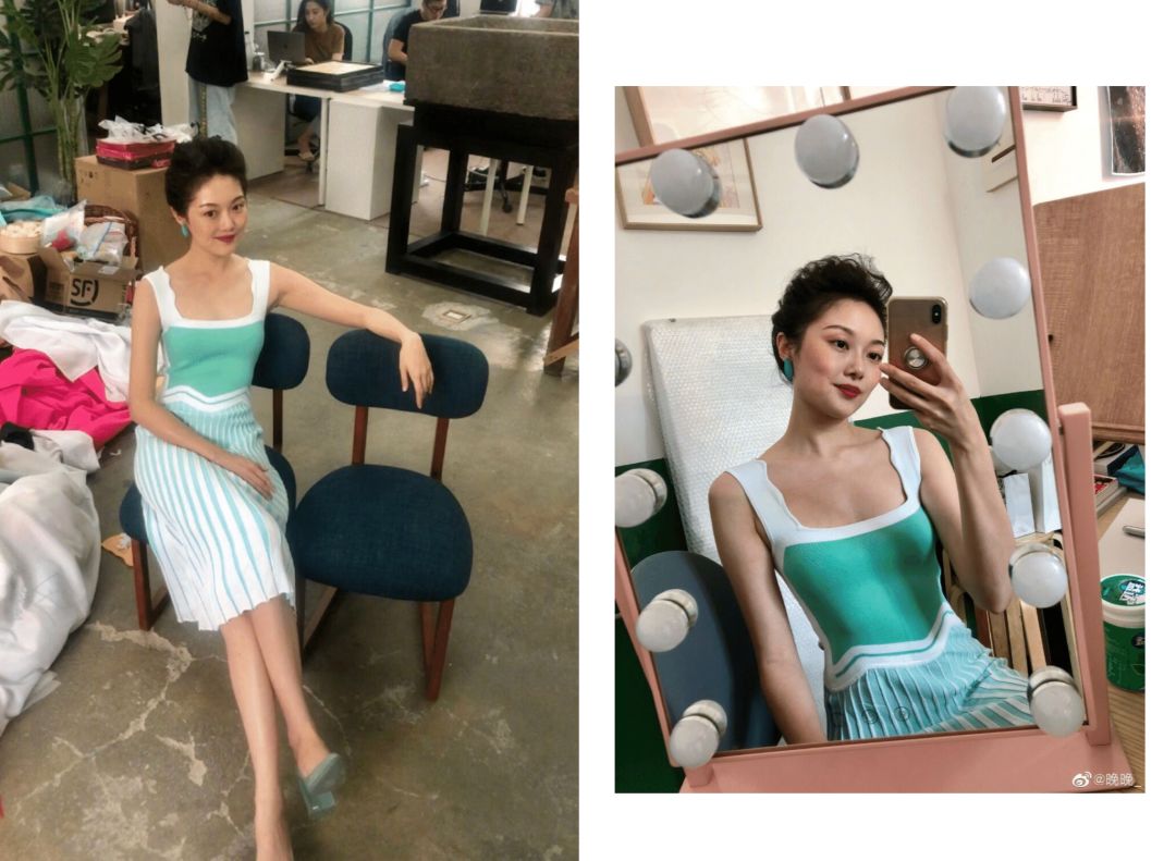 薄荷绿真是人见人爱的颜色,紧身的款式显得她身材纤细,很有香港女星的感觉。