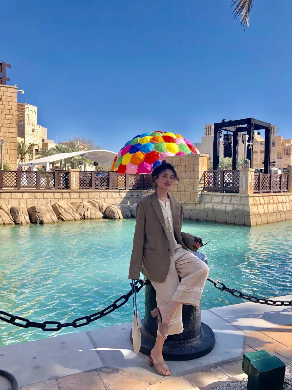 鹅黄色的西装外套更多了清爽感,浅暖色系超级提气色。(但是搭配这双鞋还是有点一言难尽......)