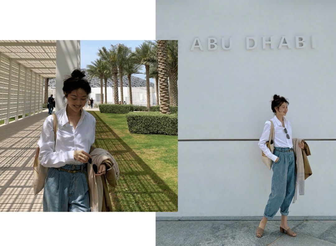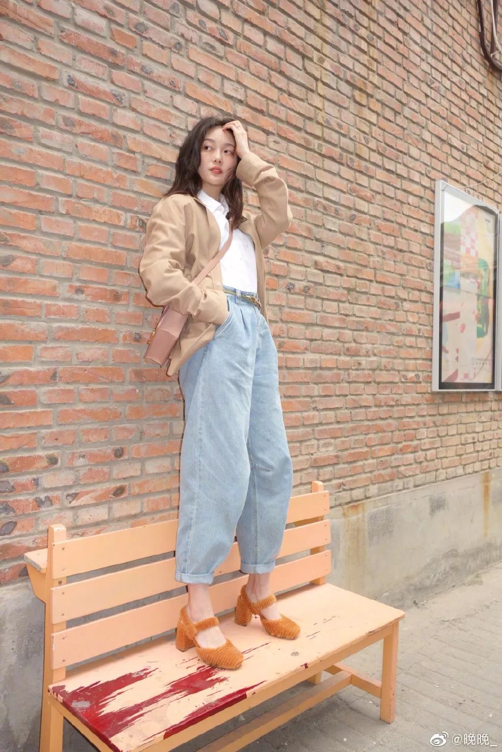 时而也很OL,简简单单的衬衫牛仔裤,因为棕色系的叠搭而更显质感。
