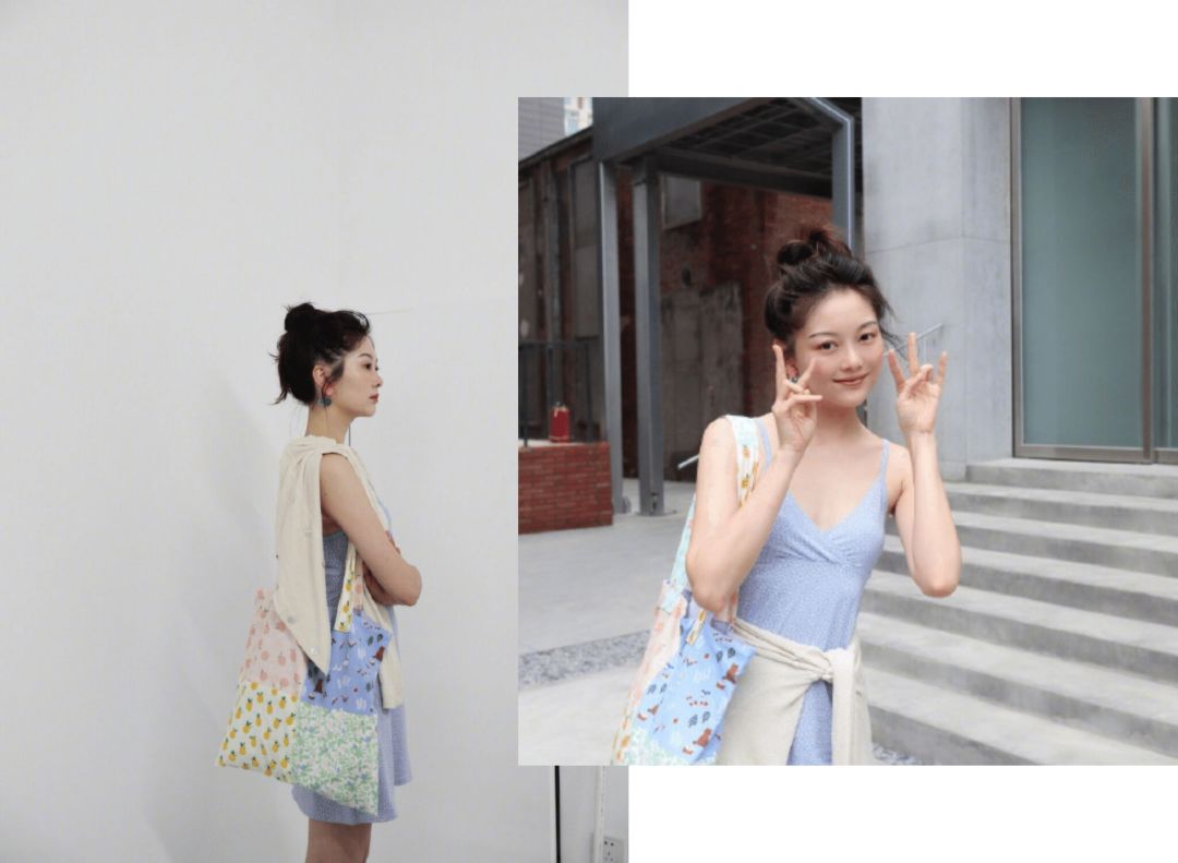 晚晚选对了一个很适合她粉调白皮清透的蓝色,搭配印花拼接帆布包,重在凸显慵懒温柔的感觉。