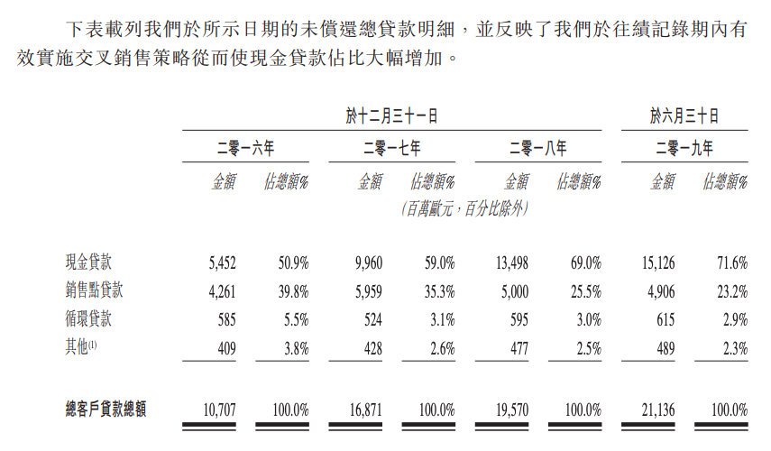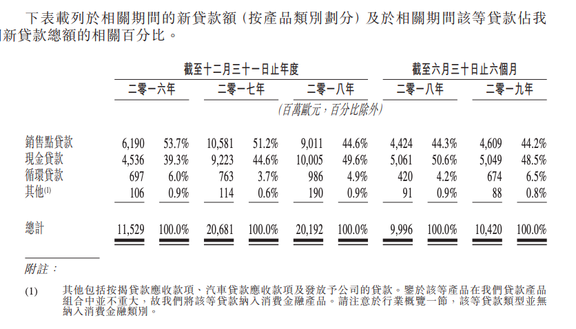 在未偿还贷款中,截至2019年6月30日,现金贷款金额为151.26亿欧元(约人民币1189.52亿元),占比71.6%,销售点贷款49.06亿欧元(约人民币385.81亿元),占比23.2%,循环贷款6.15亿欧元(约人民币48.36亿元),占比2.9%。