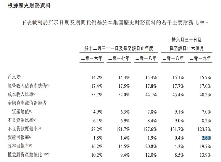 根据历史财务资料,截至2019年6月30日,成本收入比率40.2%,净息差15.7%,不良贷款覆盖率123.7%,不良贷款比率8.2%,资产回报率2.6%,股本回报率19.7%。