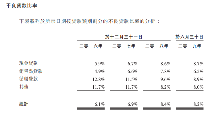 不良贷款比率方面,2016年至2019年6月30日,不良贷款率分别为6.1%、6.9%、8.4%、8.2%。截至2019年6月30日,现金贷款不良率为8.7%,销售点贷款不良率为6.5%,循环贷款不良率为8.9%。按地理区域划分的不良贷款比率来看,中国自2016年至2019年6月30日的不良贷款比率分别为4.3%、7.2%、9.7%、9.6%。
