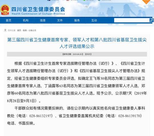 据悉,根据《四川省卫生计生首席专家选拔聘任管理办法(试行)》《四川省卫生计生领军人才选拔聘任管理办法(试行)》和《四川省基层卫生拔尖人才管理办法》规定,经省卫生健康委组织专家委员会评选,拟确定王飞等30名同志为第三届四川省卫生健康首席专家人选,丁涵露等63名同志为第三届四川省卫生健康领军人才人选,邓彦等60名同志为第八批四川省基层卫生拔尖人才人选。