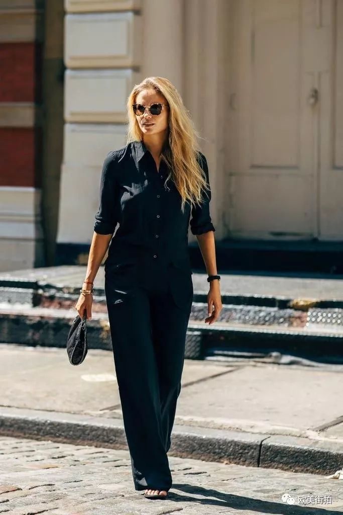 如果想要更摩登一点,可以穿双高跟鞋子,挽起袖子露出点肤色会更显得精干利落!