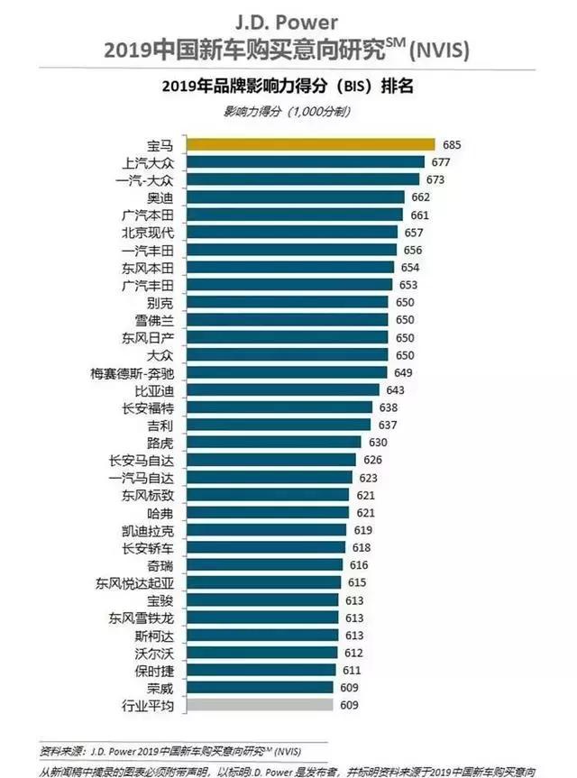 近日,消费者洞察与市场研究机构J.D. Power发布了一份2019年中国新车购买意向研究。他们通过观察研究当下消费者购买意向、行为变化,以及品牌的熟悉度和喜好度,得出了2019年上半年品牌影响力得分排名。这个排名其实去年也有,只不过今年变化颇大,不知榜单上是否有各位意向车型的品牌?