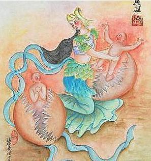 伏義、女娲兄妹为婚生了个肉蛋的神话,实则是卵生神话的变异。现在我们查询一下西南有哪些民族中间流传着这一故事。查有瑶族、仫佬族、土家族、黎族《螃蟹精》、彝族、白族、哈尼族、傈僳族、纳西族、景颇族、布朗族、普米族、怒族、崩龙族、独龙族、基诺族、苗族、布依族、水族等等。其较为完整的情节大约可用唐代李冗所记载的概括前半部分。后半部分是兄妹为婚后,生下一个大肉蛋,有砍开的,有被风吹开的,有被鸟衔开的等,肉蛋挂在树上,挂在李树上变成人,就姓李;挂在杨树上的变成人就姓杨……或者是走向四方,成为各个民族的祖先。