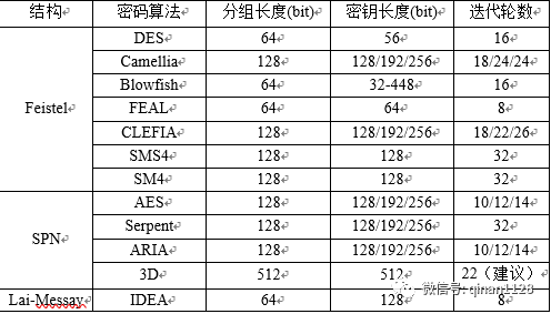 表1常见分组密码算法