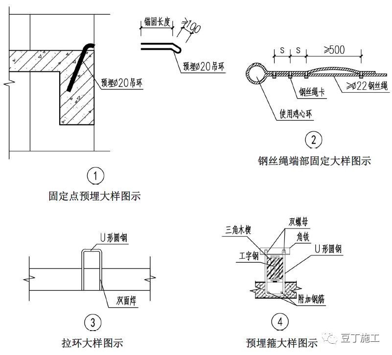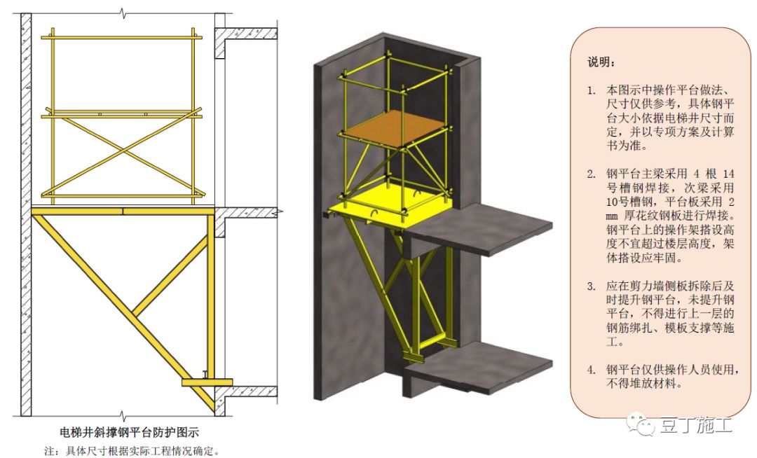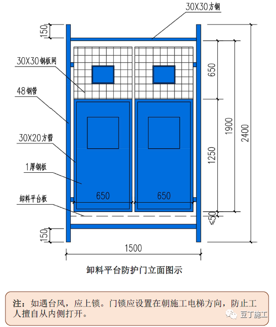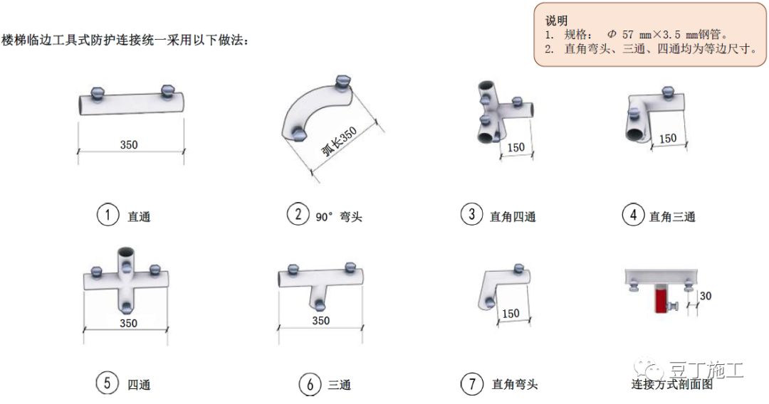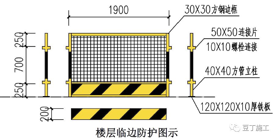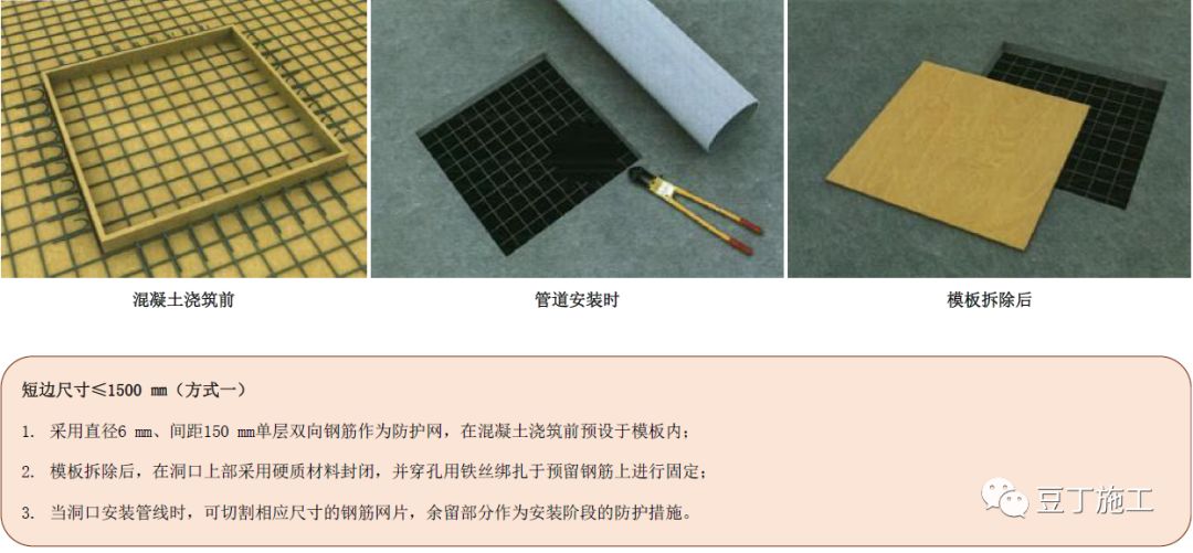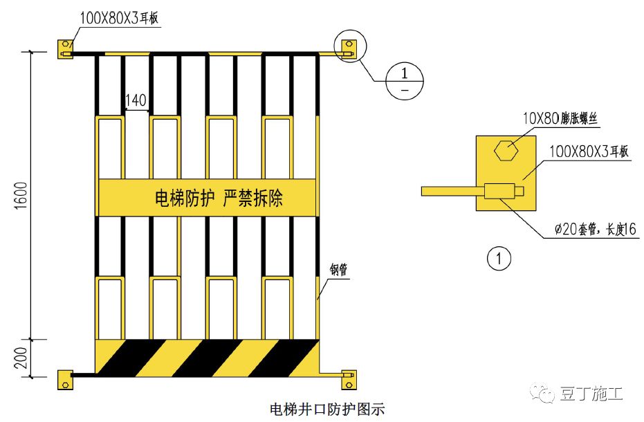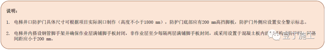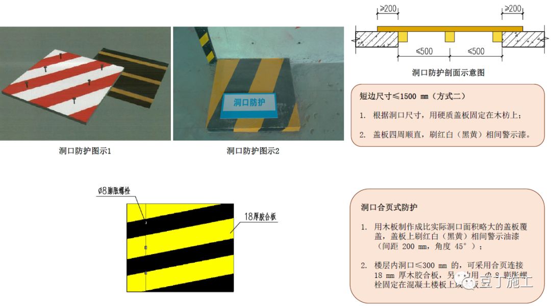 1.1“四口”是指:楼梯口、电梯口、预留洞口、通道口。根据《建筑施工高处作业安全技术规范》(JGJ 80-2016)当垂直洞口短边边长小于500 ㎜时,应采取封堵措施;当垂直洞口短边边长大于或等于500 ㎜时,应在临空一侧设置高度不小于1.2 m的防护栏杆,并应采用密目式安全立网或工具式栏板封闭,设置挡脚板;当非垂直洞口短边尺寸为250~500 ㎜时,应采用承载力满足使用要求的盖板覆盖,盖板四周搁置应均衡,且应防止盖板移位;当非垂直洞口短边边长为500~1500 ㎜时,应采用专项设计盖板覆盖,并应采取固定措施;当非垂直洞口短边边长大于或等于1500 mm时,应在洞口作业侧设置高度不小于1.2 m的防护栏杆,并应采用密目式安全立网或工具式栏板封闭,洞口应采用安全平网封闭。