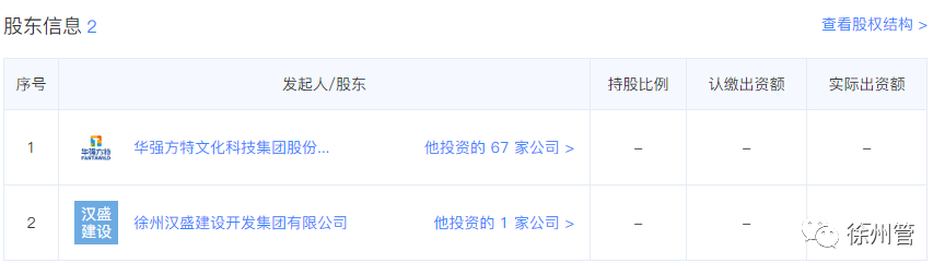 上文提到的徐州汉华景文化科技有限公司,今年5月份刚刚成立,股东只有两家:华强方特文化科技集团股份有限公司和徐州汉盛建设开发集团有限公司。