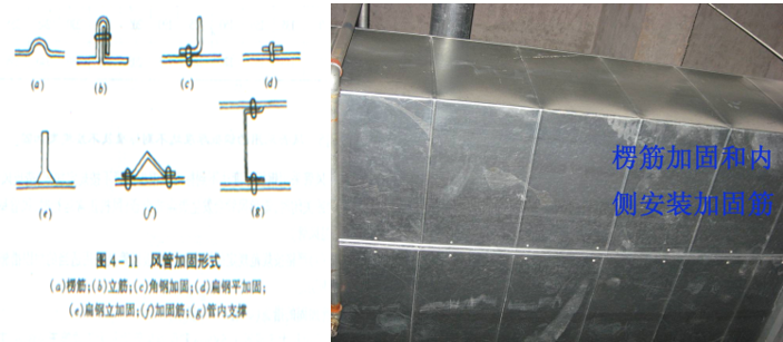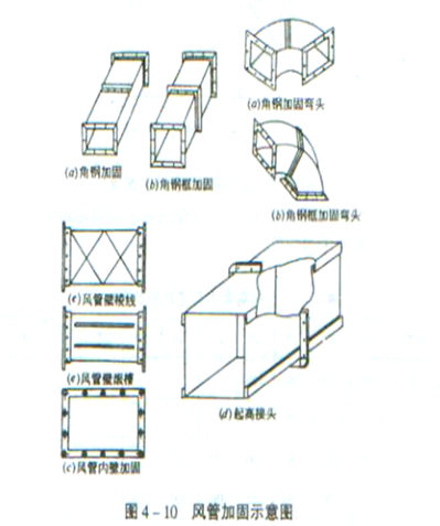 (4) 风管加固形式可采用楞筋、立筋、角钢、加固筋和管内支撑等(如图4-11)
