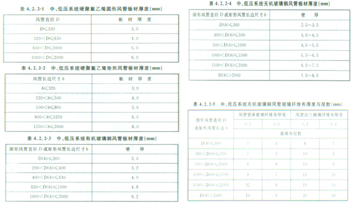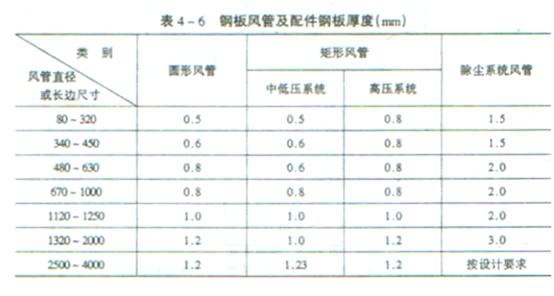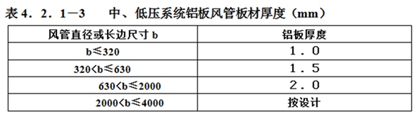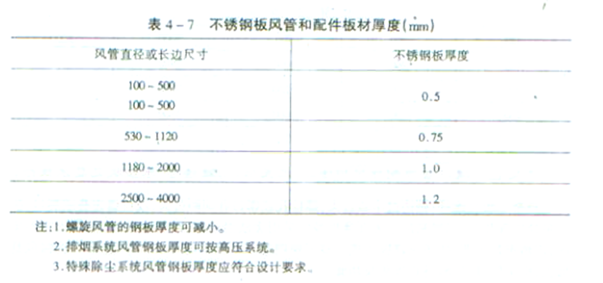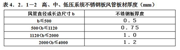规范要求:4.2.1金属风管的材料品种、规格、性能与厚度等应符合设计和现行国家产品标准的规定。当设计无规定时,应按本规范执行。钢板或镀锌钢板的厚度不得小于表4.2.1-1的规定;不锈钢板的厚度不得小于表4.2.1-2的规定;铝板的厚度不得小于表4.2.1-3的规定。