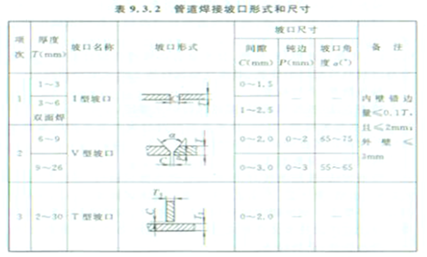 规范要求:9.3.2金属管道的焊接应符合下列规定:1管道焊接材料的品种、规格、性能应符合设计要求。管道对接焊口的组对和坡口形式等应符合表9.3.2 的规定;对口的平直度为1/100,全长不大于10mm。管道的固定焊口应远离设备,且不宜与设备接口中心线相重合。管道对接焊缝与支、吊架的距离应大于50mm。2管道焊缝表面应清理干净,并进行外观质量的检查。焊缝外观质量不得低于现行国家标准《现场设备、工业管道焊接工程施工及验收规范》的规定(氨管为ш级)。