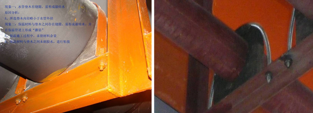 后果:风管、水管隔热层固定不牢或从风管、水管表面脱落、空鼓,以致风管、水管外表面无隔热层,造成能量散失,影响使用效果,而且夏季还可能在风管、水管表面形成冷凝水。加快风管、水管的腐蚀。