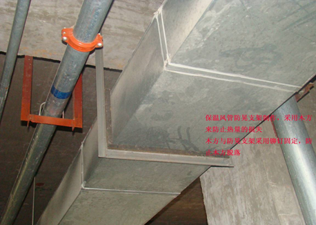 5、当水平悬吊的主、干风管长度超过20m时,应设置防止摆动的固定点,每个系统不应少于1个;固定支架应设在接近系统的起、止点及改变方向等处,以确保风管不晃动为原则;