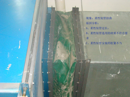 措施:柔性短管的主要作用是隔振,常用于风机及空调设备的进、出口处。作为与风管的连接管。由于系统的使用条件不同,柔性短管需承受的压力变化和温度、湿度的变化你也不同,所以要求柔性短管应采用减震、防潮、不透气、不霉变和防火的要求。