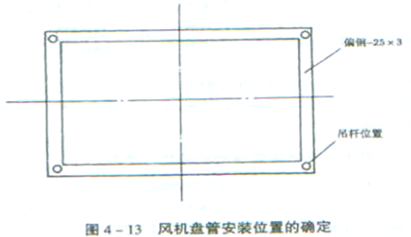 (1)风机盘管的安装位置(指纵横直线)应正确,风管或水管的连接不得与设备强制对口,进出口轴线中心应与机组在同一轴线上。为使定位准确,安装在吊顶内的机组可用样板定位,同一型号的机组吊杆位置应是一致的,可用扁钢(25×3)作一四角打孔,标出吊杆位置及轴线,将样本放在顶板上划好位置,为安装提供方便,以利于风机盘管及风管的安装,如图4-13所示;