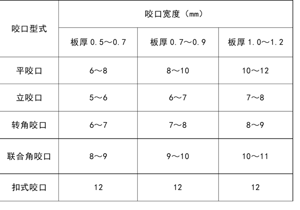 (3)咬口的宽度主要依据风管的板材厚度决定,咬口的宽度、留量以及重叠数与使用的机械有关,一般来说,咬口留量对于单平咬口、单立咬口、单角咬口在第一块板材上等于咬口宽,而在第二块板材上是两倍宽,这样咬口的留量就等于三倍的咬口宽。另风管的咬口宽度应符合下表: