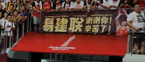 相比于上场对阵韩国队,广州体育馆今晚的气氛更加高涨,全场座无虚席。在球员通道上方,有球迷挂上写有“易建联,谢谢你,辛苦了”的海报。很多球迷穿上国家队球衣,挥舞手中的国旗,成为中国男篮的坚强后盾。