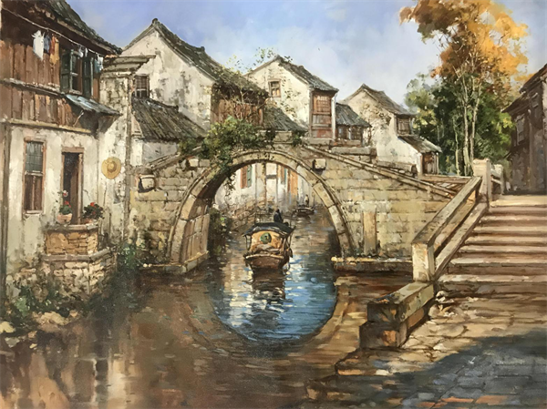 上面这幅作品画面取材是春日清晨的景致。在宁静、安谧、清新、高爽的格调中,船家划桨来。画家对色调的处理和光的丰富表现惟妙惟肖。画面笔触厚重沉着,富有肌理感,似乎倾诉着岁月磨蚀的沧桑和悠远,传达着画家对水乡的深深眷恋,是画家最成功的题材。艺术并不等同于自然,不是对自然的模仿,而是艺术家借用自然物象表达自己对生活的印象与所思所想。