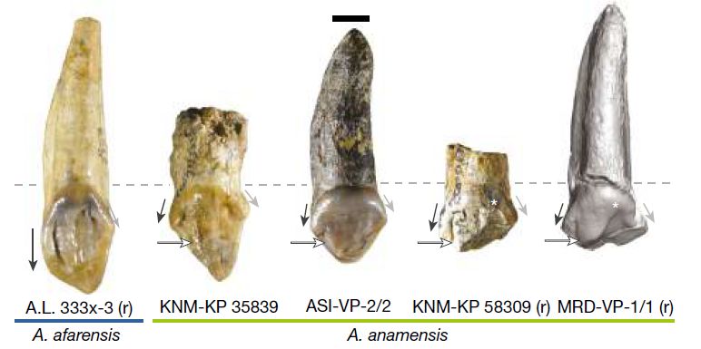 门齿对比照片,左1属于南方古猿阿法种,其余属于南方古猿湖畔种。