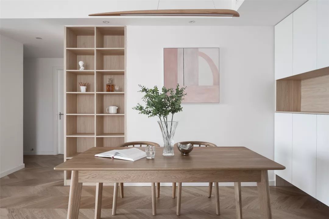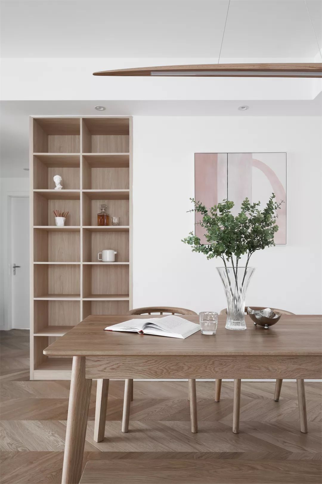 ▲餐厅背景墙侧边墙面打掉与双向柜体定制,餐边这侧做成展示格架柜,旁边墙面挂一幅粉色调的装饰画,让空间显得温馨而优雅。