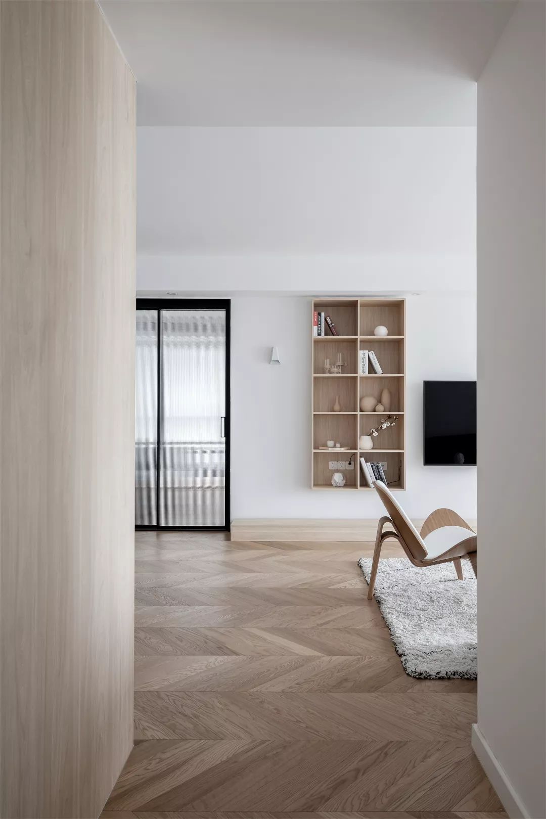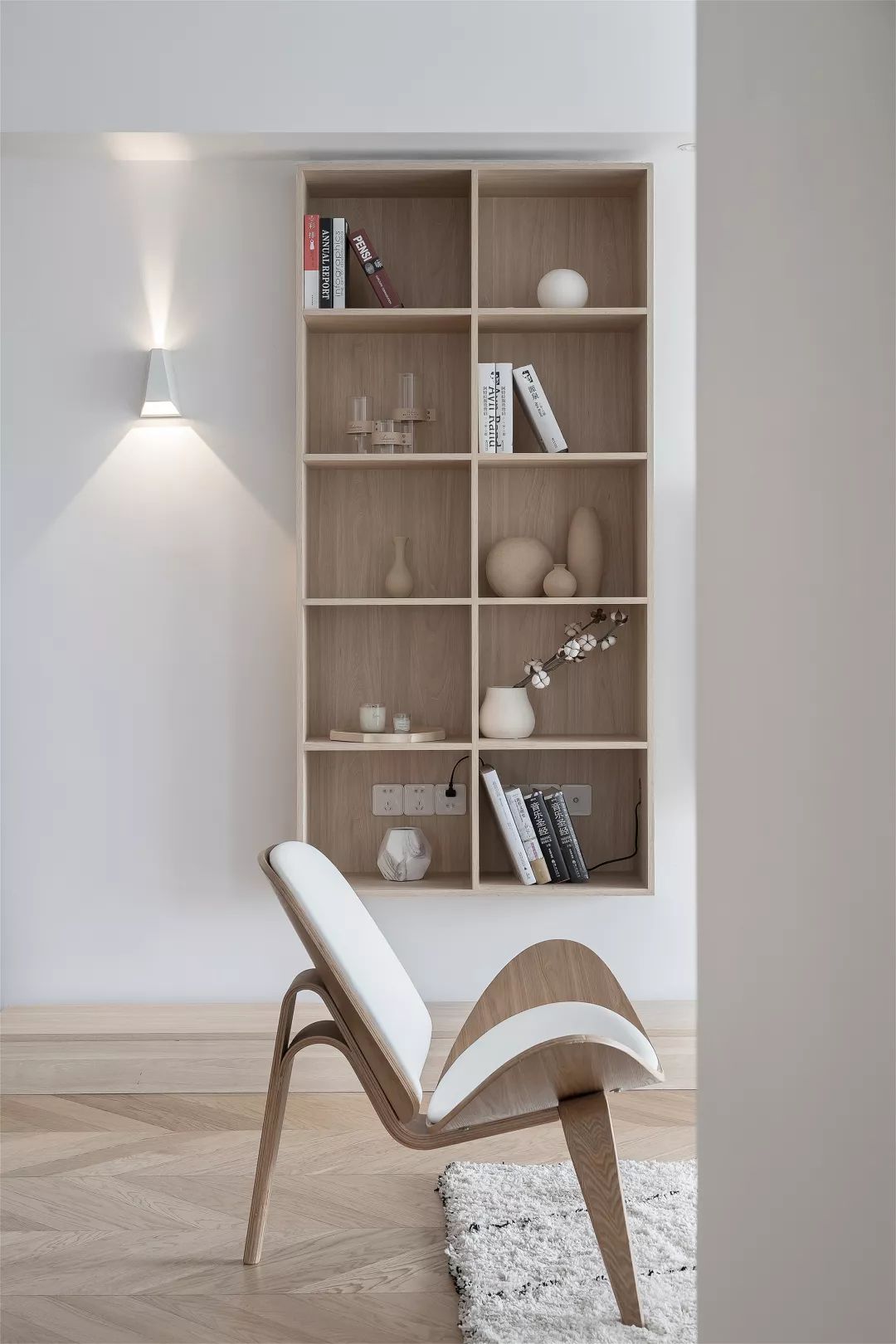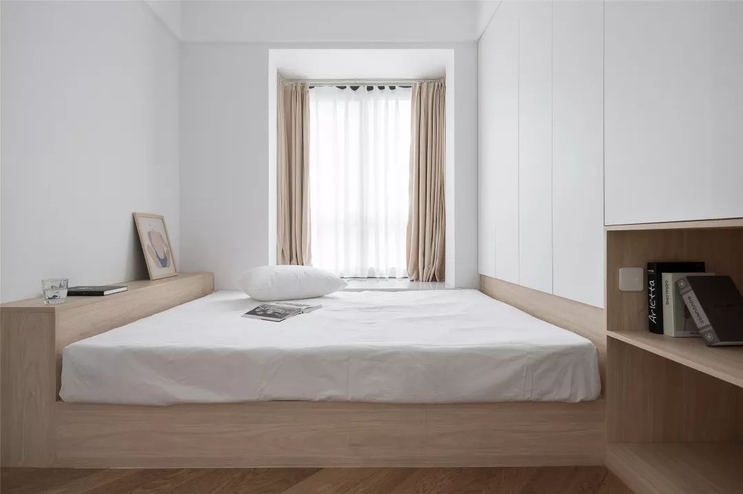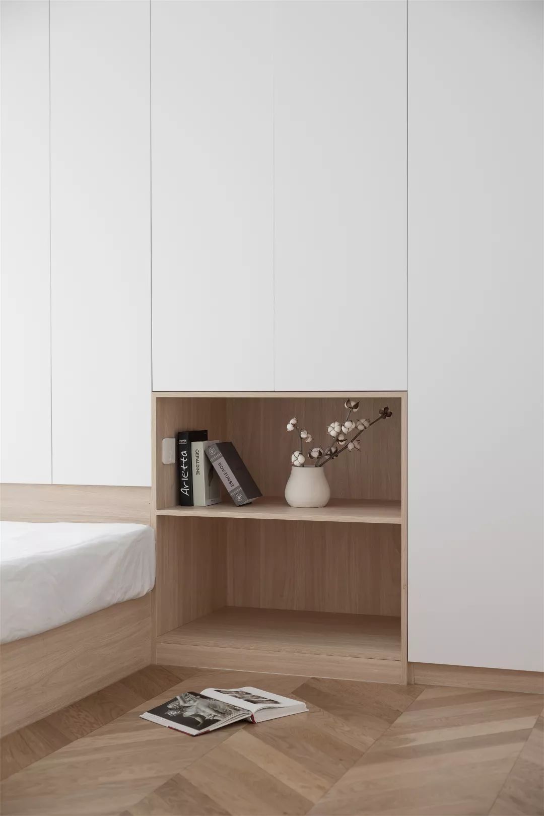 ▲小卧室以定制榻榻米+衣柜组合设计,洁白的墙面与柜门,搭配木色的榻榻米与格架,让空间自然而又美观。