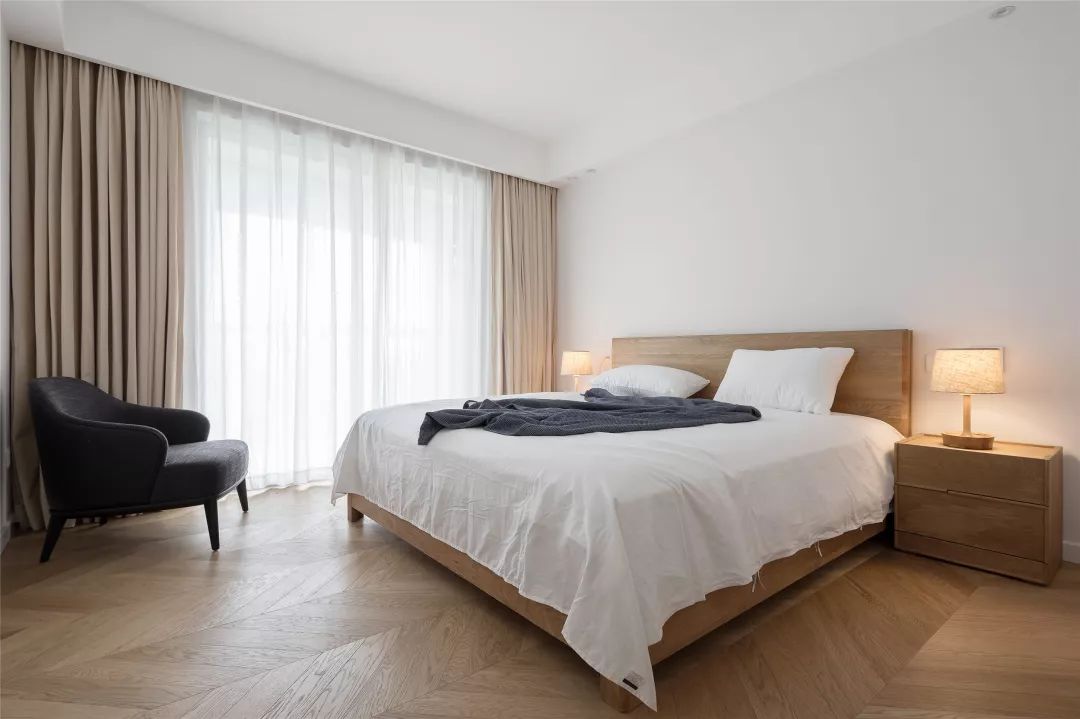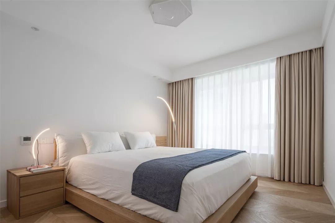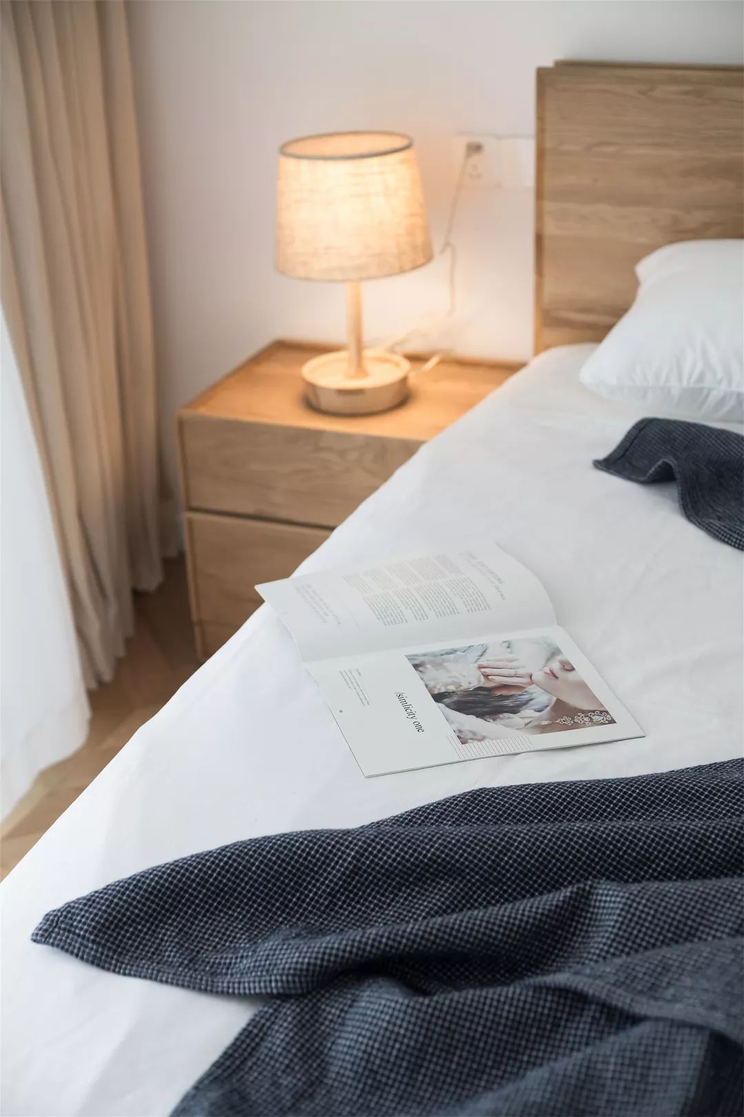 ▲次卧空间也是非常的简洁,鱼骨拼的木地板,搭配木质床与床头柜,对称布置床头台灯,整个空间都充满了舒适轻松的年轻感。