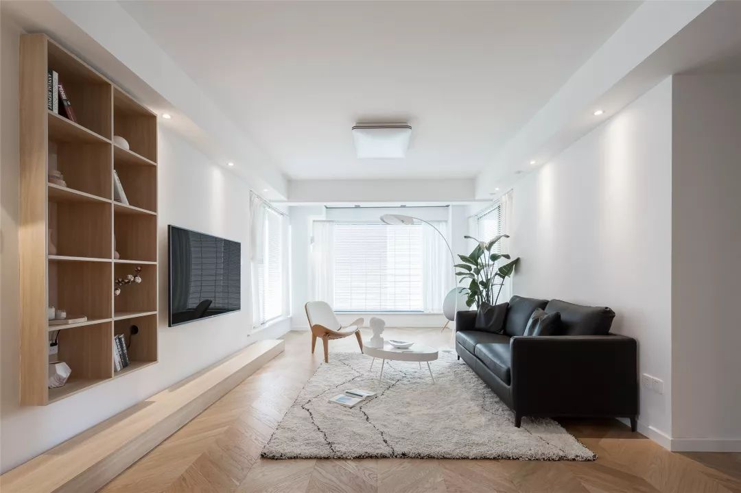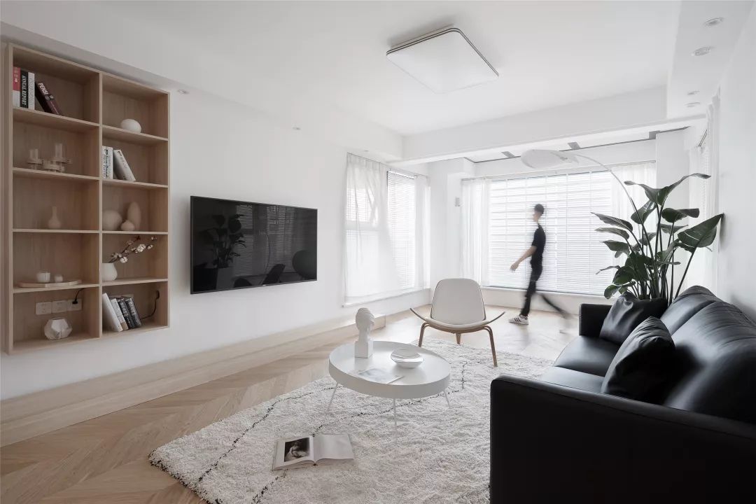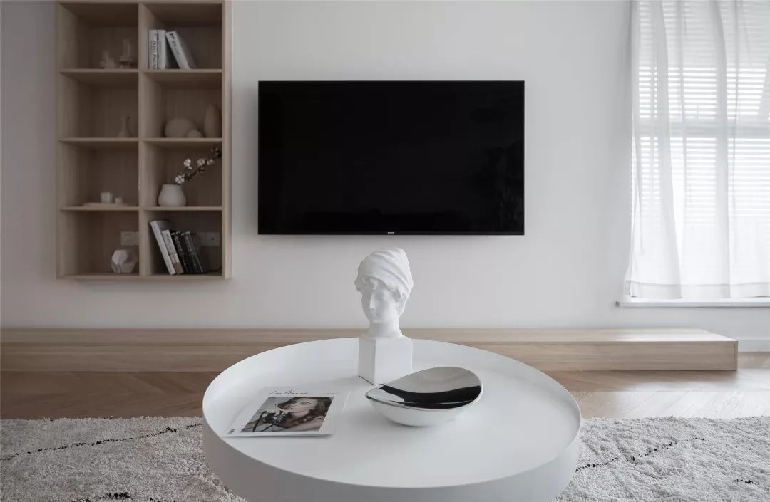 ▲现代简洁的客厅,电视墙取消了电视柜,在壁挂电视机左侧装了一个木质的展示架,布置上书籍与陶艺品,让空间显得自然而气质。