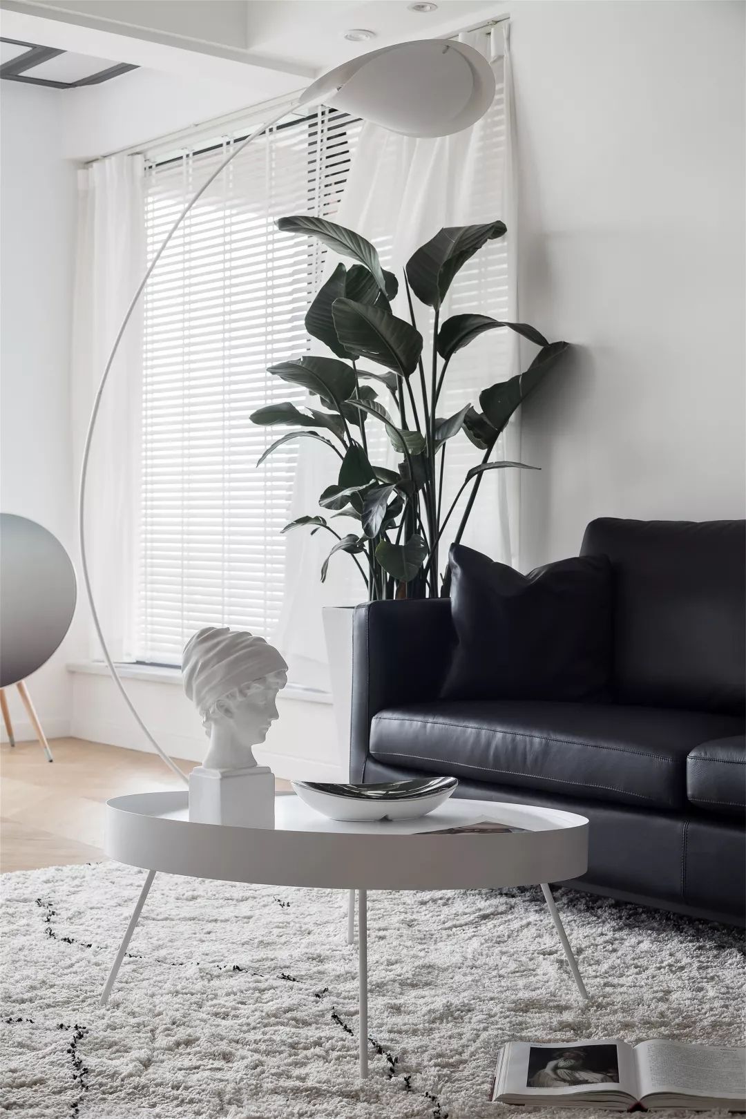 ▲简洁的沙发墙,布置一张黑色皮沙发,搭配一席地毯、摆一张小巧的圆茶几,让简单的空间也显得端庄大气。