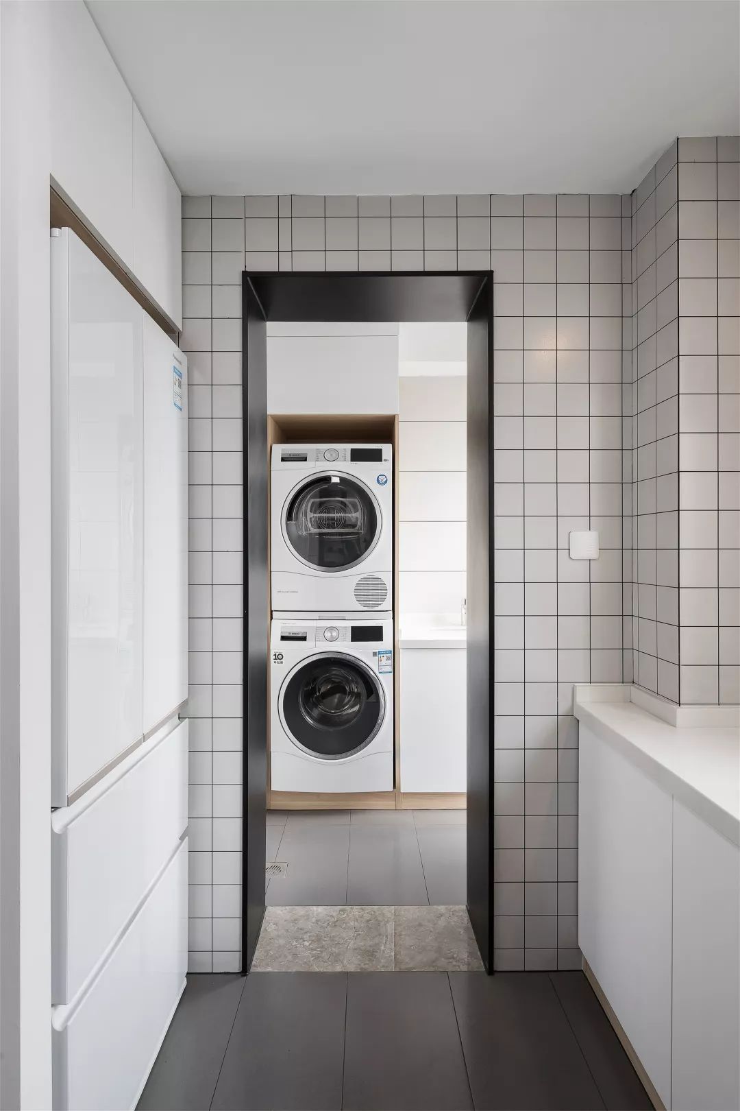 ▲生活阳台与厨房之间打通,中间的门垛没装门,以不锈钢包边的门框处理,外面的洗衣机布置在洗衣池旁边,整体设计布置简洁自然。