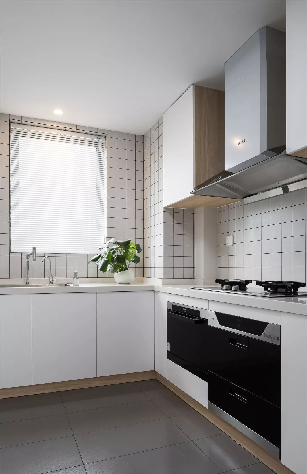 ▲L形的厨房,在灰色地面砖的基础,白色小格砖+摆设橱柜搭配,整体厨房空间明亮而又雅致舒适。