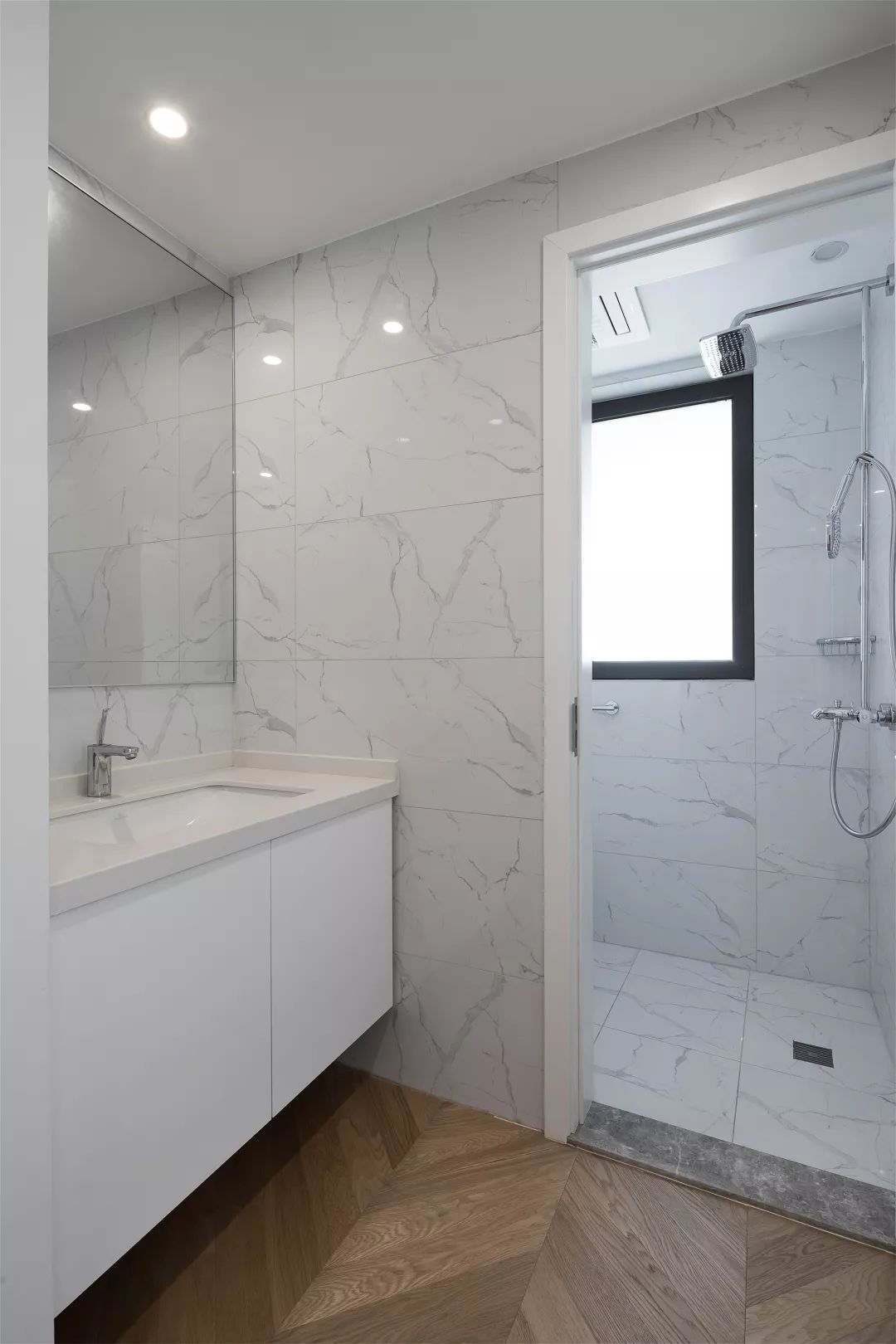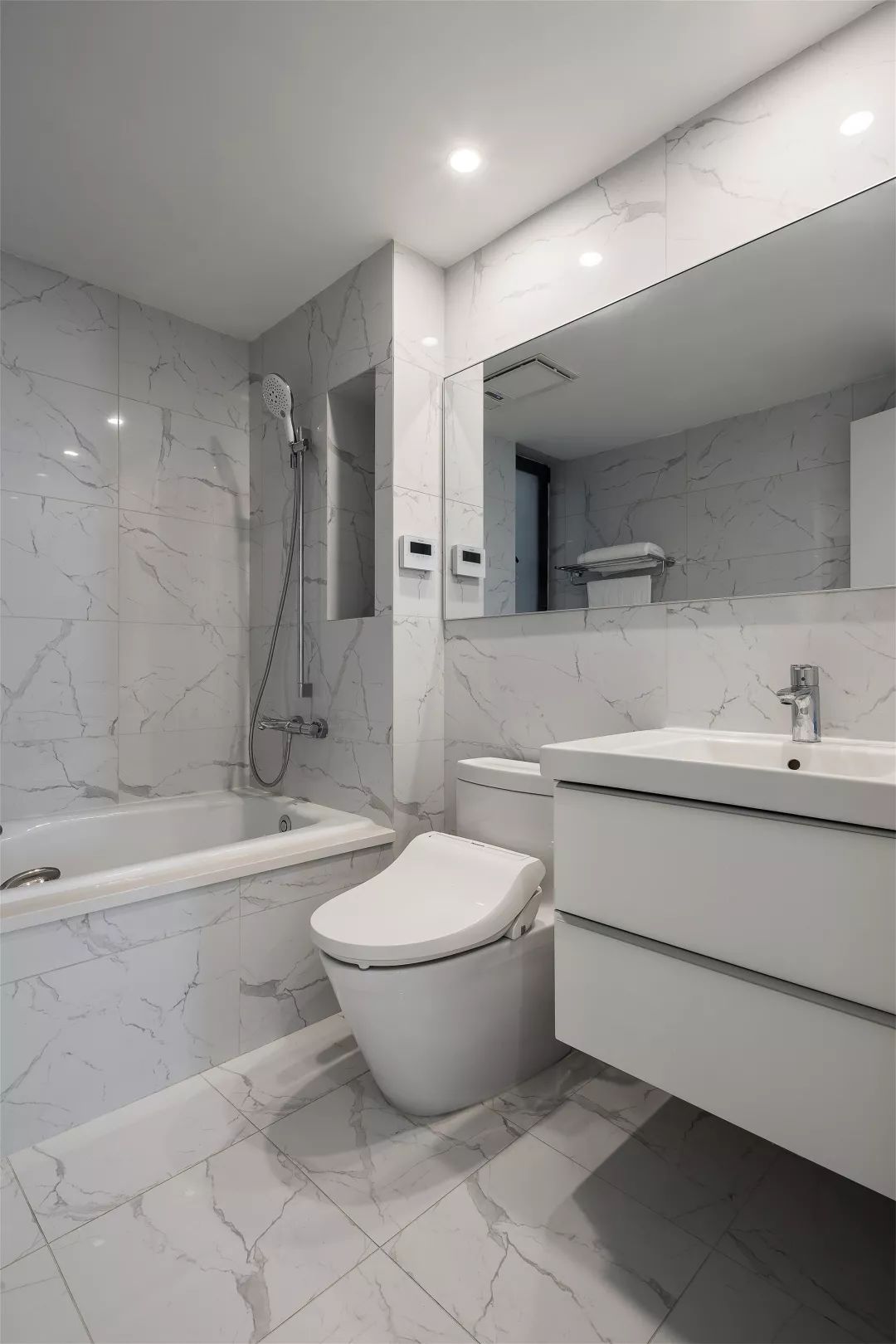 ▲主人卫生间在雅白的地面墙面下,装一个白色的洗手盆柜,设置一个浴缸,为主人提供了一个简雅舒适的卫浴享受空间。