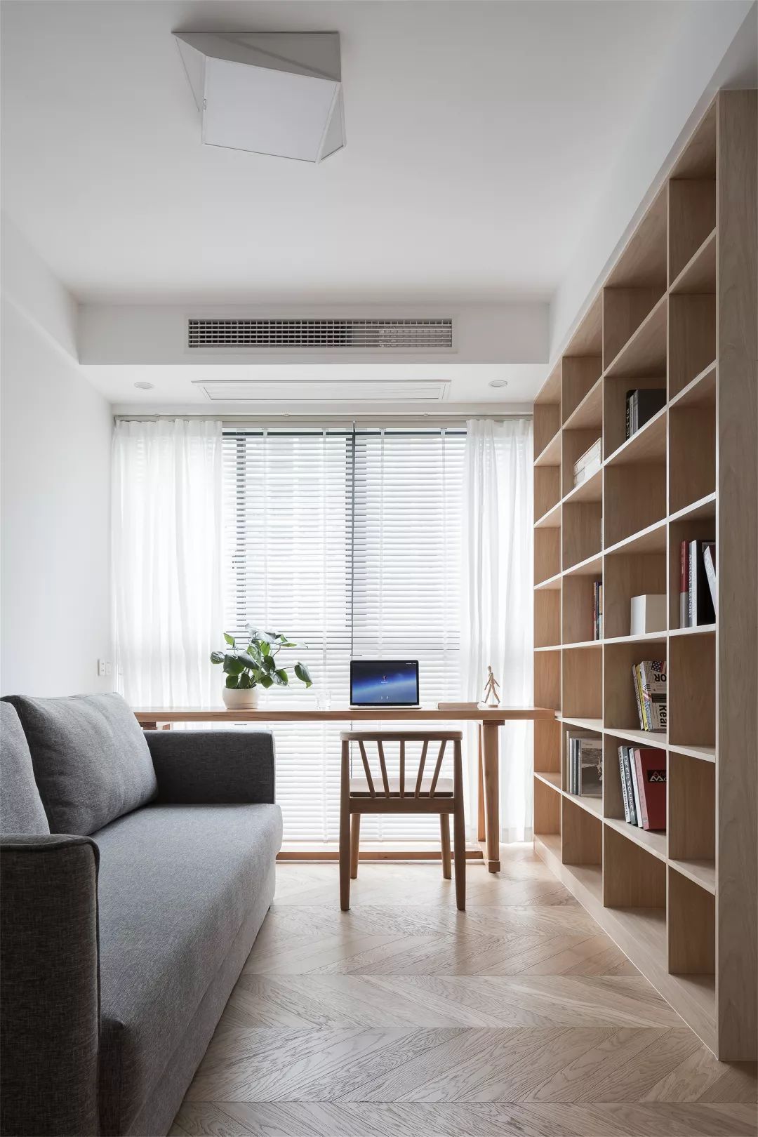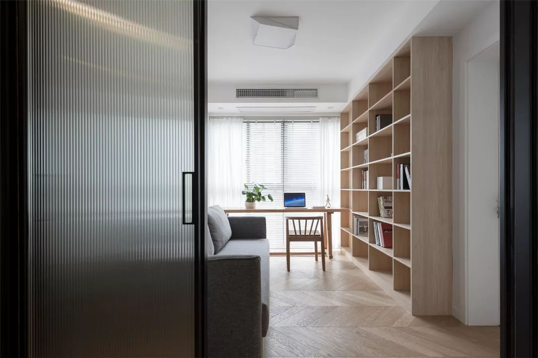 ▲书房以长虹玻璃门隔断,布置了沙发与书桌,定制一面大书架,整个空间简约而又优雅舒适。