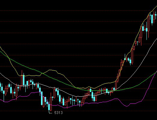 当价格运行在BOLL中轨和上轨之间的区域时,只要价格不跌破中轨,说明市场处于多头行情中,逢低点买进,不考虑做空。