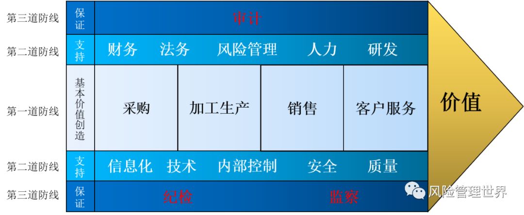 我们能够看到的是,这样的方法最开始是从内部审计职能引入的,有很多关于企业三道防线的资料都是出自一些国际的审计相关组织。