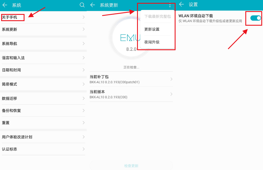 操作流程:【设置】-【系统】-【关于手机】→【wifi环境自动下载】