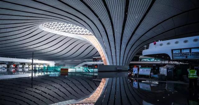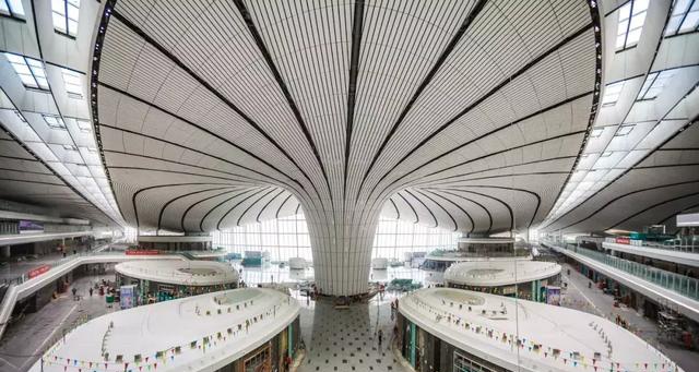 像雪花,像海星,像大兴的“兴”字,像人的五个手指头……大兴国际机场的外观造型能让你充分发挥自己的想象。不过它的设计寓意其实是一只展翅欲飞的凤凰,与状若游龙的首都机场T3航站楼遥相呼应,有“龙凤呈祥”之意。机场以主航站楼为中心,向四周散射五条指廊。指廊共分布有50个登机口,旅客从主航站楼的任何位置步行至最远登机口的时间不超过 8 分钟。