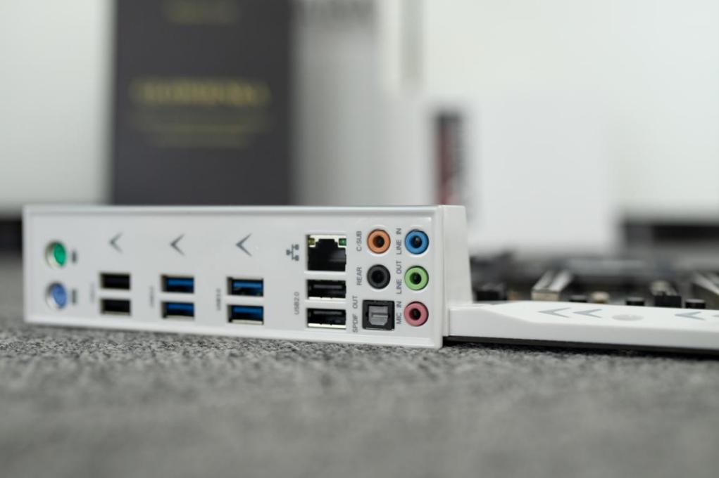 这款主板的I/O区域接口齐全,使用了预装一体化背板。常规接口有四个USB2.0接口,四个USB3.0接口,音频方面有5个3.5mm接口和一个数字光纤音频接口,一个网卡接口。