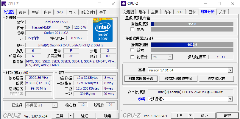 两个平台在CPU-Z得分分别是4632.6和4772.2,跑分相差不多。