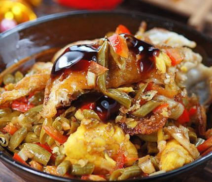 6、再把切好的酸豆角丁、蒜蓉、姜末倒入锅内,加入生抽、蚝油与荷包蛋一起翻炒提香