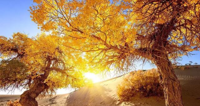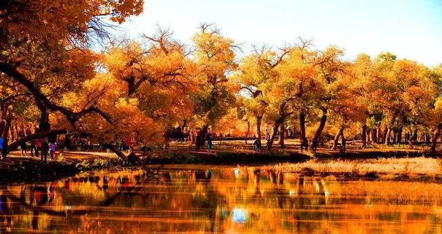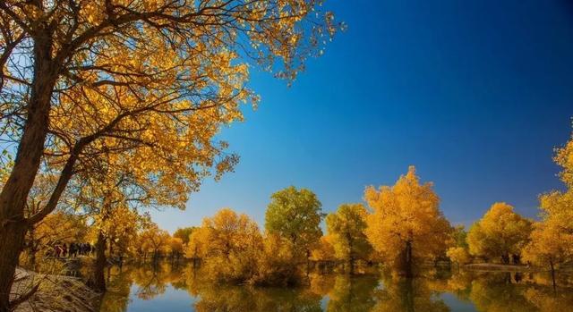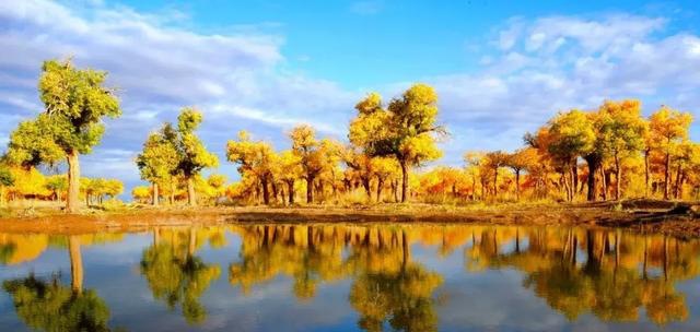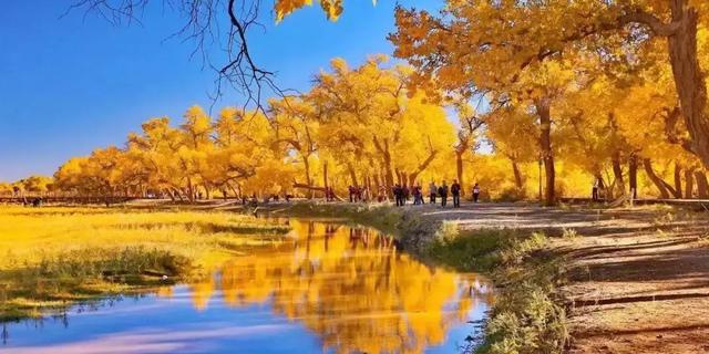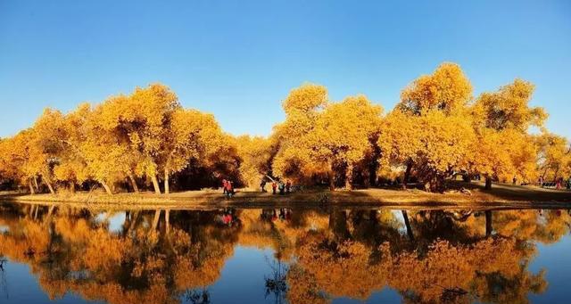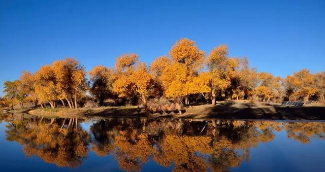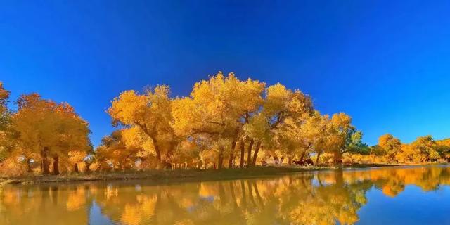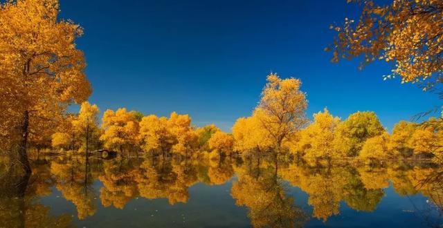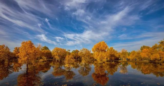 9月底至10月中,当萧瑟的风从巴丹吉林沙漠的旷野中吹来,额济纳旗凉意泛起,各种草木渐衰,唯有胡杨,树树秋声,沾染了灿烂的金黄。这种荒原上最为坚韧的植物在秋霜袭来后变换姿态,点缀着蓝天与湖泊,勾勒出一个色彩斑斓的童话世界。
