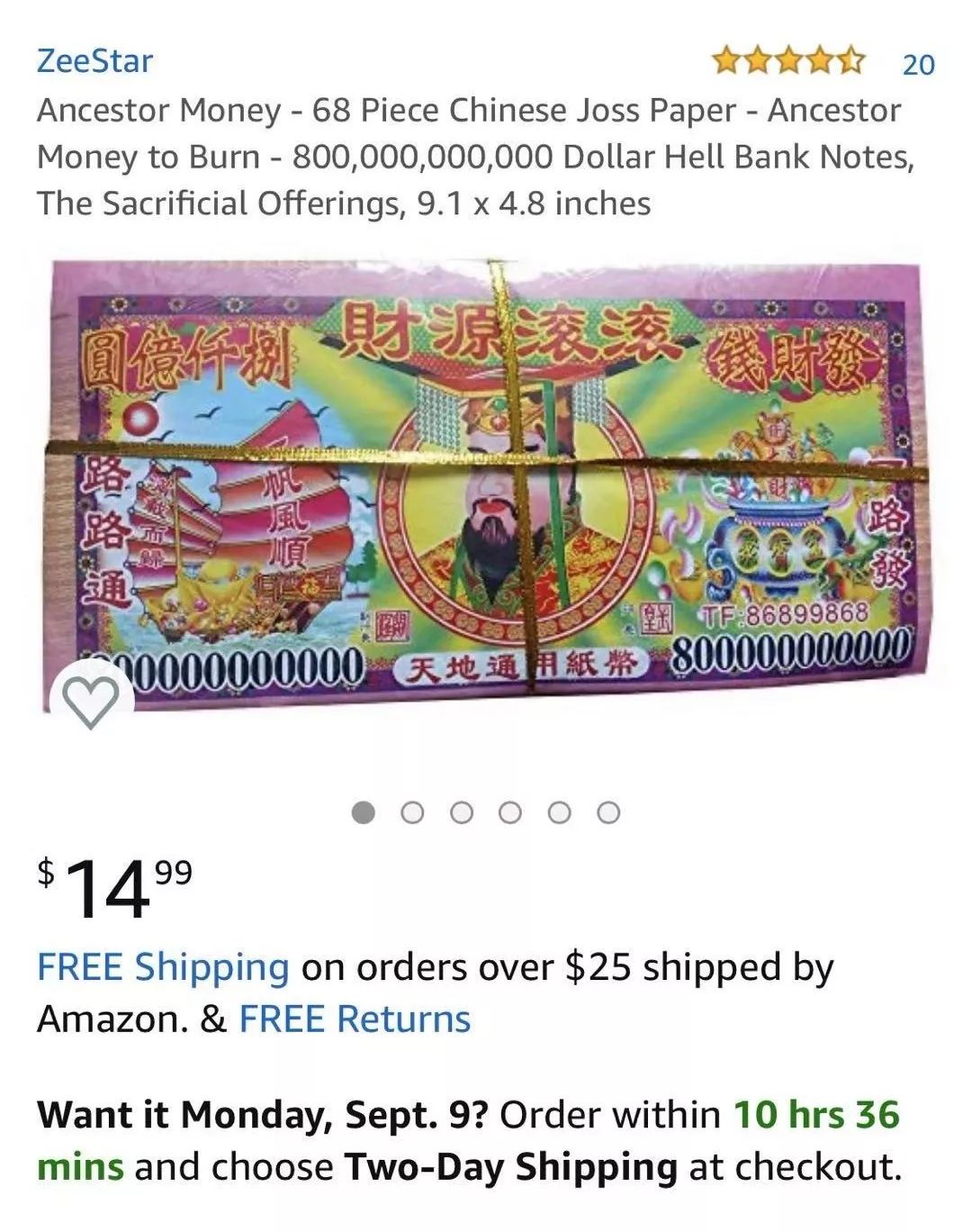 与国内低廉的价格相比,祖先币在国外其实价格不菲。我们上坟的时候都是一捆一捆的烧,而老外只能几张几张的烧。