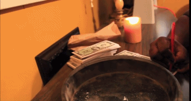然后把闭口的那一面点着,放进你准备的盆里,大小视你准备烧多少钱而定。