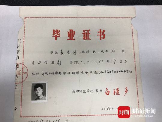 袁光涌今年73岁,退休前曾是成都市府青小学的一名教师。两张毕业证书已经有些残破,色褪有些发黄,但却见证了在上世纪六十年代,如袁光涌一般的高中毕业生如何成长为一名人民教师。