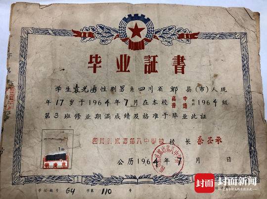 1964年,17岁的袁光涌在成都第八中学高中毕业。他捐赠的毕业证书上,显示着姓名、性别、籍贯和年龄等信息,“1964级第3班修业期满成绩及格准予毕业”,毕业证上同时记录着学生在校期间同时印有四川省成都第八中学校的公章和校长名字。