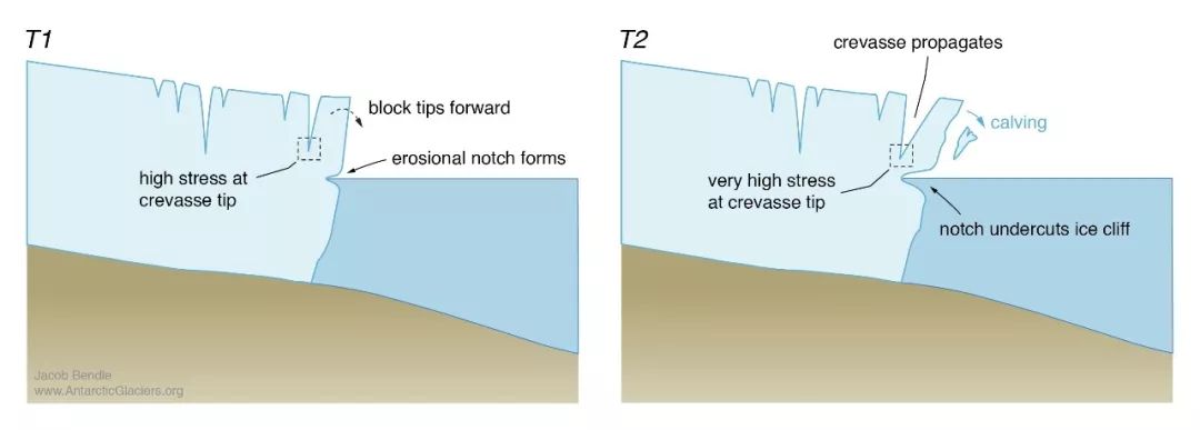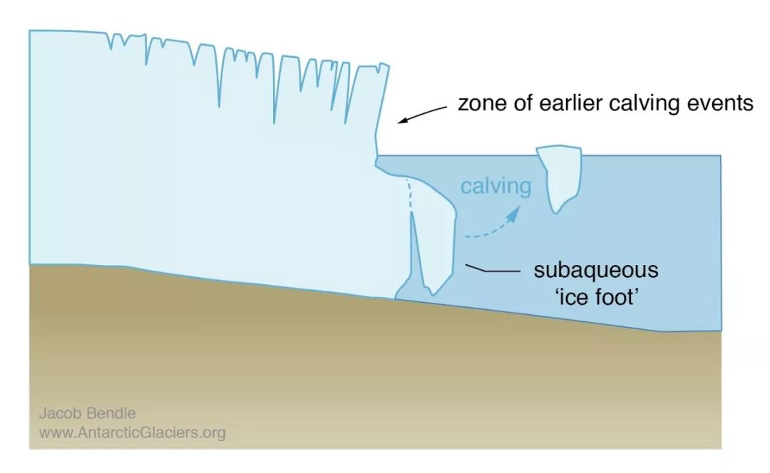 水的温度比冰川要更高,水与冰川接触的切面就像利刃一样不停地横切着冰川,待它融进了冰川里面之后,切面以上的冰川或是慢慢融化,或是因失去支撑而崩裂坠落。