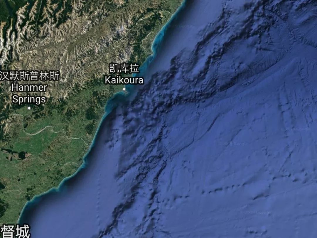 在凯库拉往北直至北岛的East Cape,太平洋板块的海洋地壳朝着澳大利亚板块的陆地地壳俯冲,形成了Hikurangi海槽;