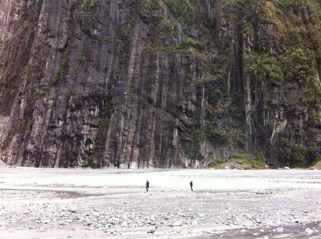 在福克斯冰川的峡谷,可以在两侧的崖壁上清楚地看到植被与裸露岩壁交接的线条(下图冰川终端右侧),那里就是曾经1998年冰川所在的位置。